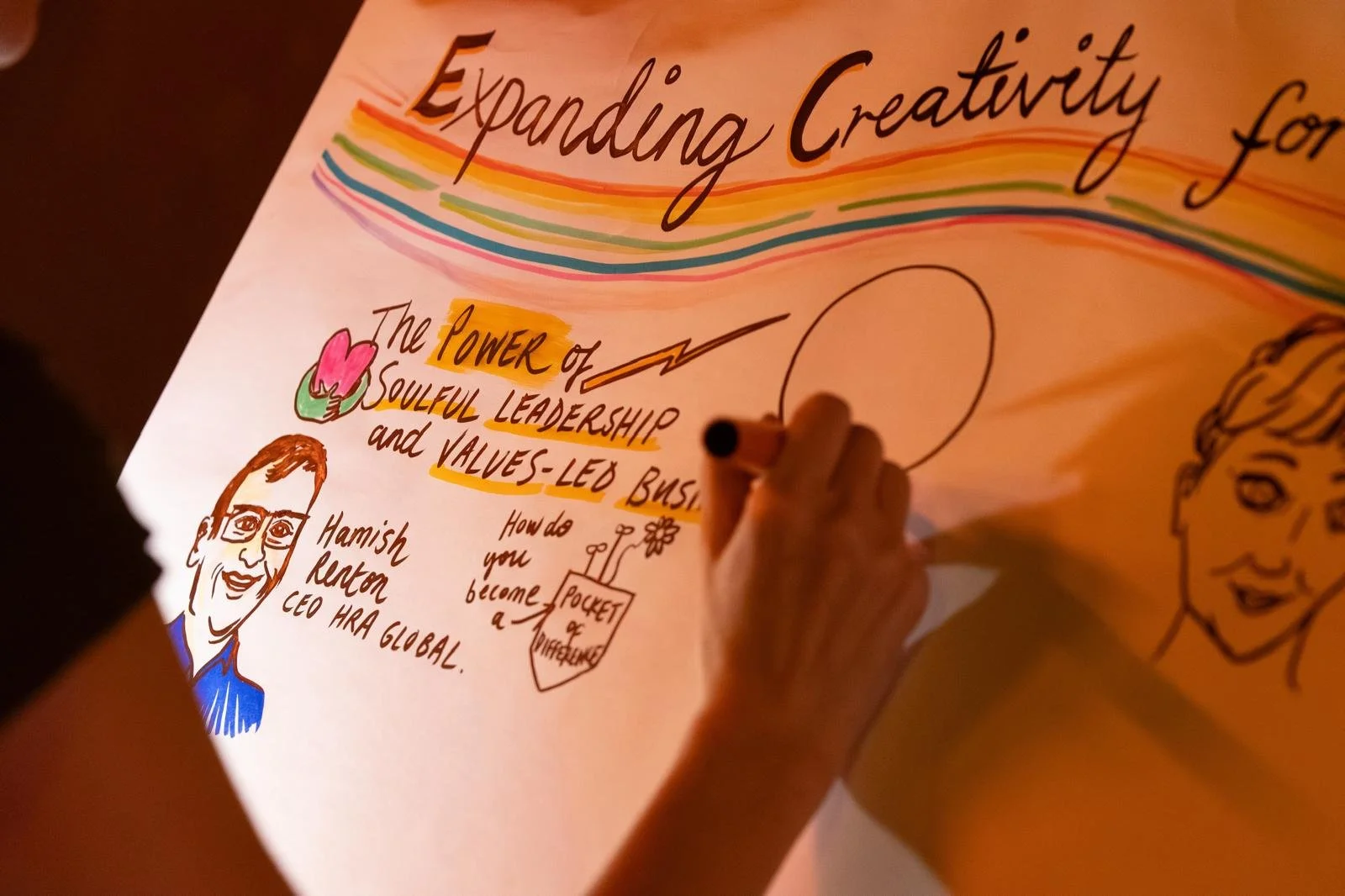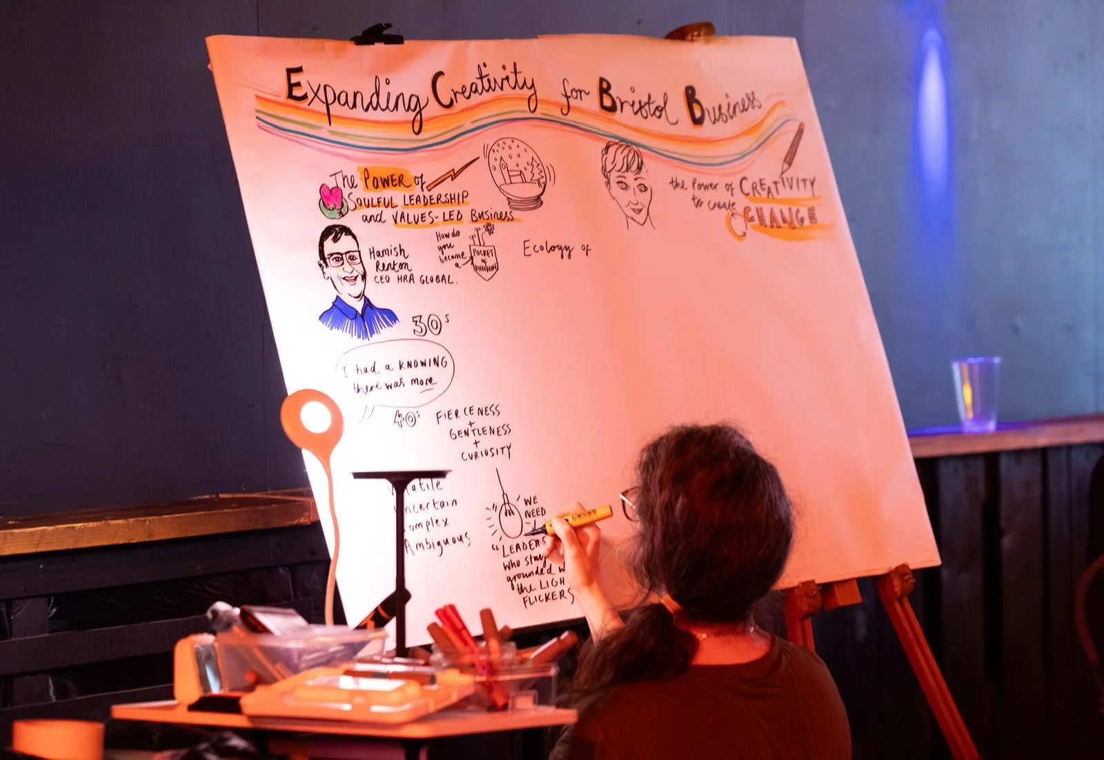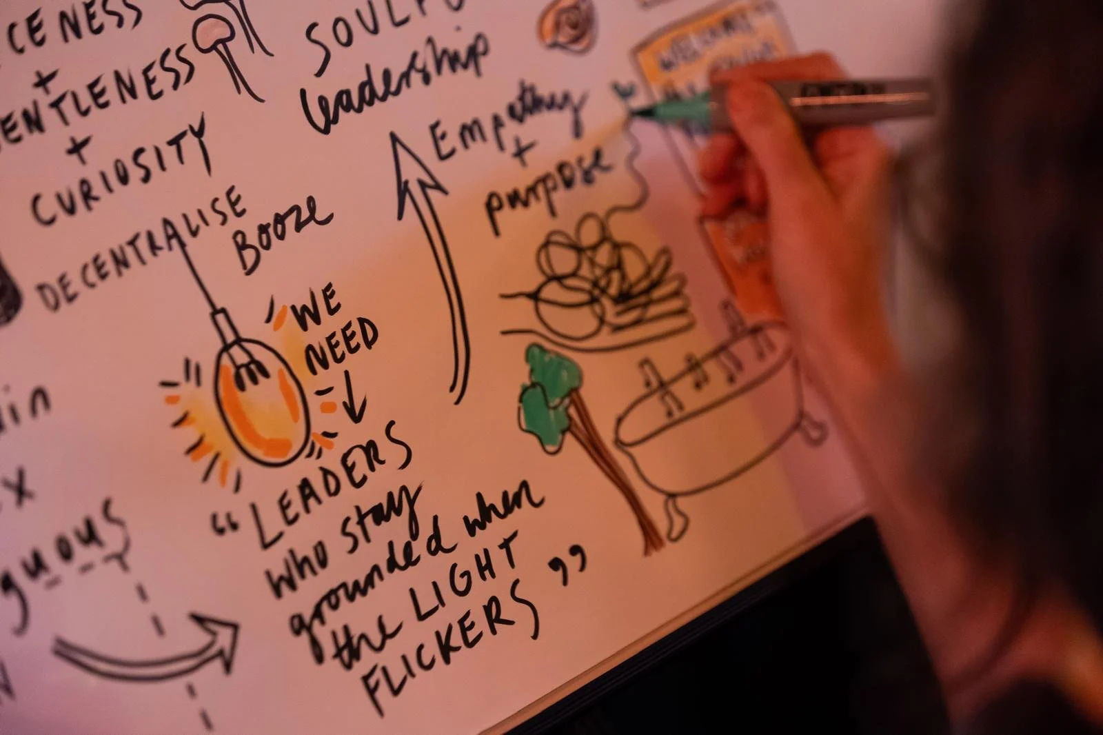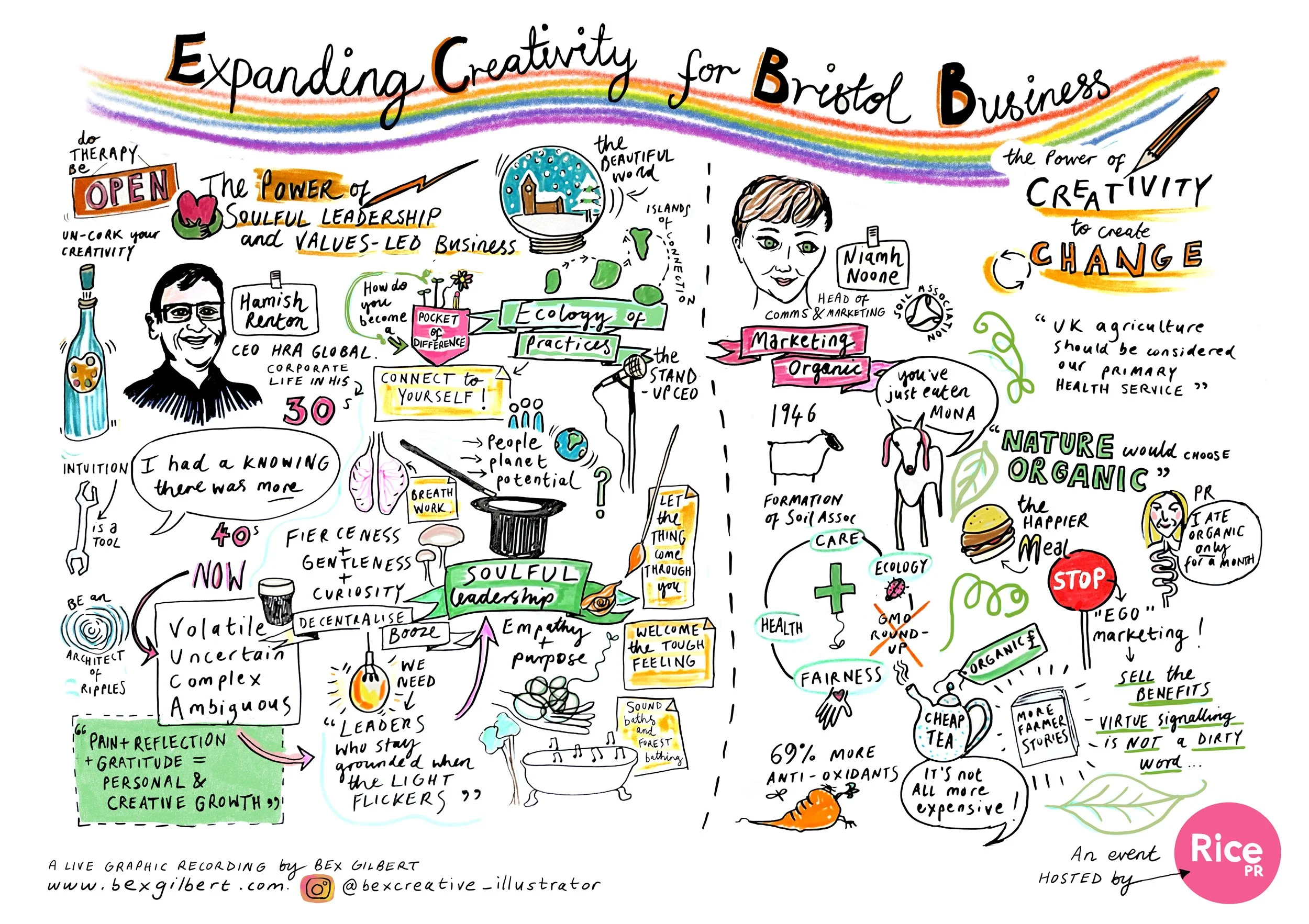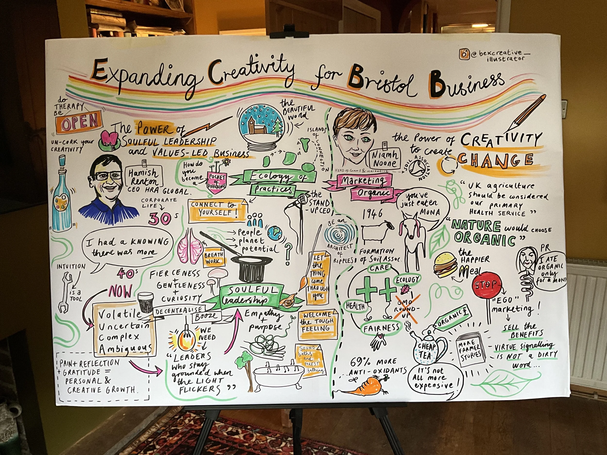 To suit this creative theme, Sarah commissioned me to live illustrate the first two of her events. The pictures you can see here are of the second, in January, 2026, featuring inspirational businessman Hamish Renton, who talked about creative and soulful leadership, and Niamh Noone, head of marketing and comms at the Soil Association, who talked about marketing organic.