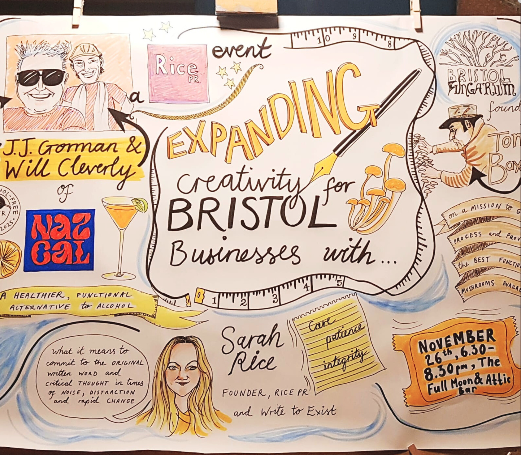 Brainchild of Sarah Rice, founder of Rice PR, the Expanding Creativity for Bristol Businesses events series brings together Bristol’s progressive business community to explore how creativity + communications can help save the world.