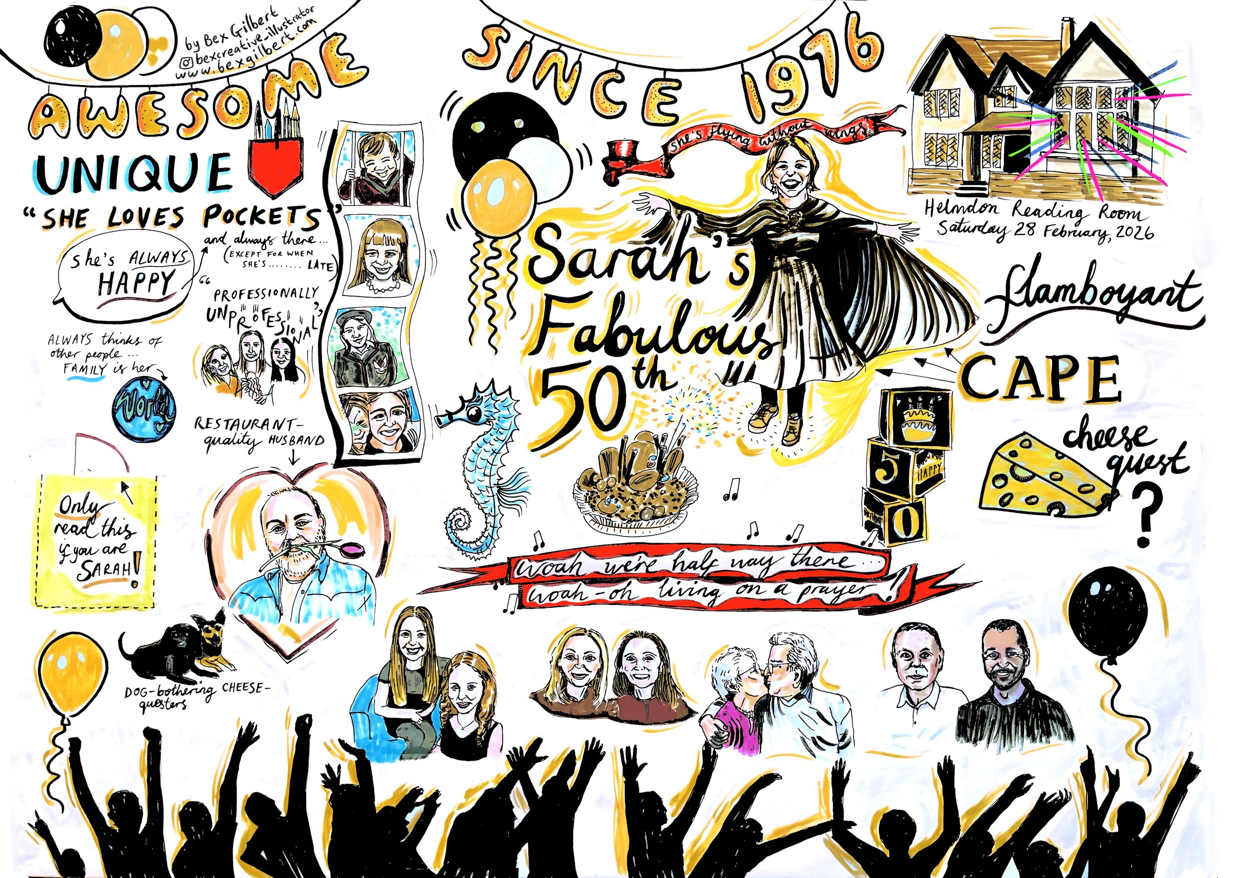 I also offer a service where I provide a graphic recording of your event on an A1 or A3 drawing board (see examples below). For this I act as a floating presence at your event, capturing the event and the vibe on a drawing board I carry around, and providing you with a large image of the whole event, featuring elements like the band, entertainment, table details and perhaps some of the more notable dance-floor contributions of your guests (!). I also love graphic recording the contents of speeches!!