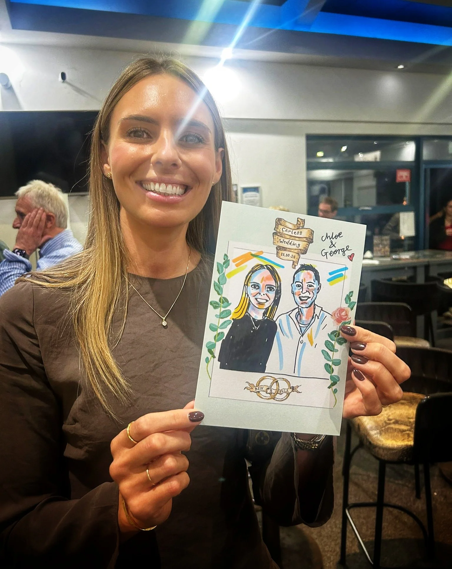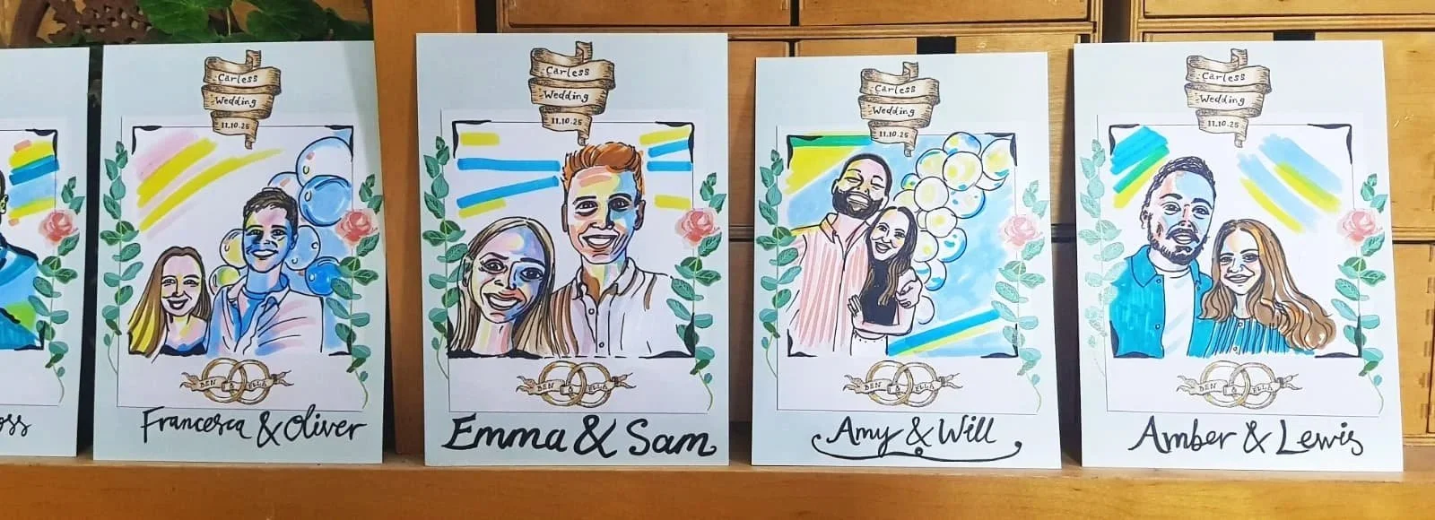 Personalised event stationery: I can either draw onto blank card or design pre-prepared portrait cards (like the ones you see in the images on this page) for a small additional fee. Typically I can create a frame design with the names of the couple and their wedding date, or add corporate logos and the title of events, and a few other small design elements around the edge. Usually this will be done at a fee of around £100, which includes printing of around 50 cards - enough for the portraits with some left over for you to use as thank you cards, potentially, wiht your own message. Please discuss options on booking.